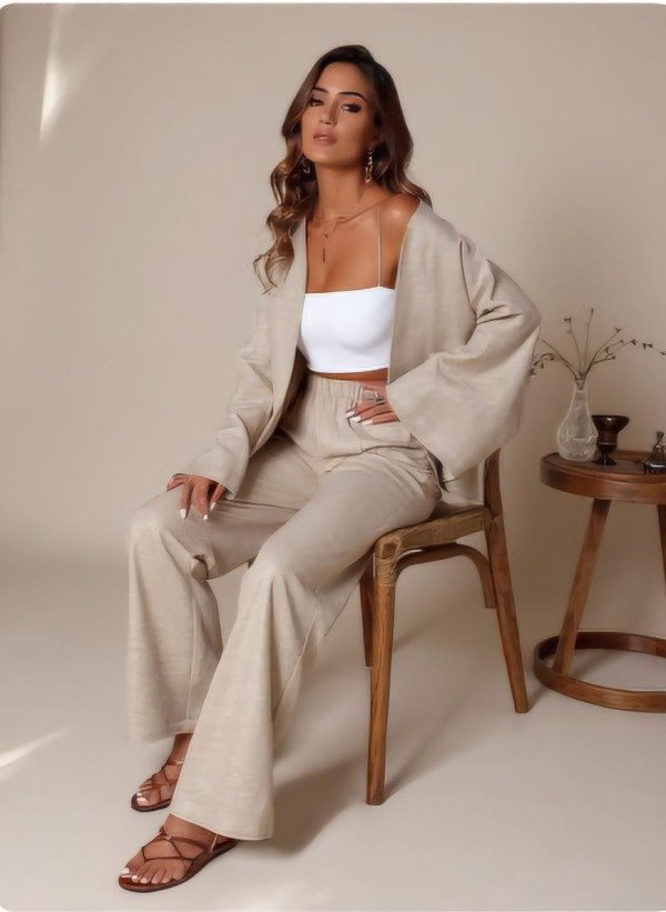 El conjunto esta compuesto por 1 pantalón con bolsillos y elastico y en la cintura y un Saco