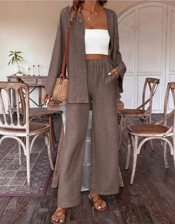El conjunto esta compuesto por 1 pantalón con bolsillos y elastico y en la cintura y un Saco